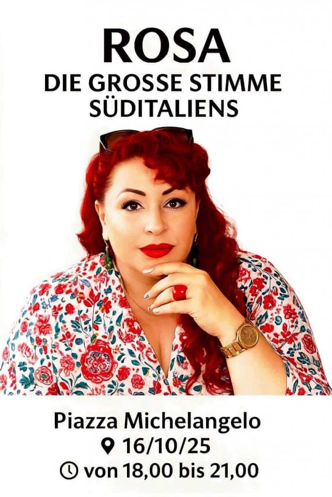 https://www.casa-michelangelo-berlin.de/wp-content/uploads/italian.mp4 ROSA – Die große Stimme Süditaliens Am 18.12.2025 erwartet Sie auf der Piazza Michelangelo ein unvergesslicher Abend voller Emotionen und musikalischer Leidenschaft. Von 18:00 bis 21:00 Uhr erleben Sie Live Musik mit ROSA – einer der beeindruckendsten Stimmen Süditaliens, die mit ihrer Ausstrahlung und ihrem einzigartigen Timbre das Publikum in ihren Bann zieht. Genießen […]